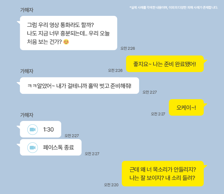 이 단계에서 가해자는 이미 연락처 탈취를 위한 해킹을 완료한 상태이기 때문에 협박용 영상 확보를 위해 은밀한 화상 채팅을 유도합니다.