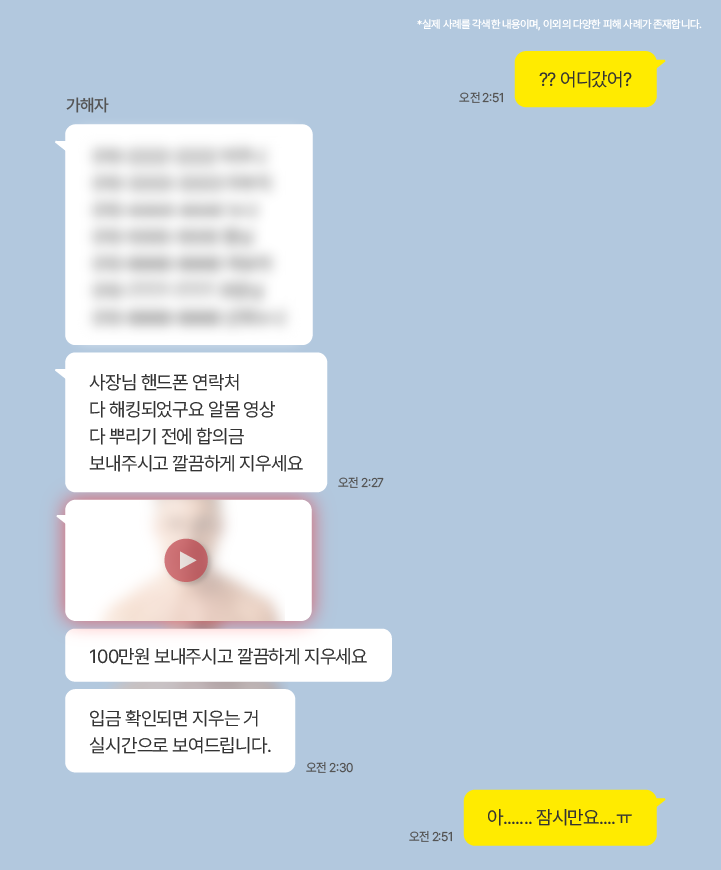 은밀한 영상까지 확보한 가해자는 본격적으로 금전을 요구하는 협박을 시작하게 됩니다. 이때, 가해자에게 입금을 한다면 집중 타겟이 되어 더 큰 협박과 금액을 요구받게 됩니다.